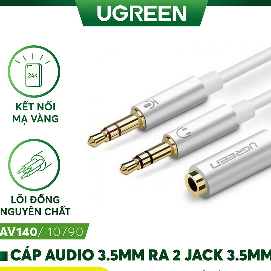 - Cáp Audio 3,5mm âm ra 2 đầu 3,5mm 1 Mic 1 loa Ugreen 20899 mạ vàng cao cấp chuyển đổi tính năng một 3.5mm âm và hai 3,5mm kết nối dương , cho phép bạn kết nối một 4 vị trí tai nghe (audio & micro) với một máy tính / máy tính xách tay có micro và âm thanh riêng biệt cổng. Nó hoạt động với tất cả các ứng dụng máy tính - Skype, MSN Mesenger, Yahoo, Google Voice, vv