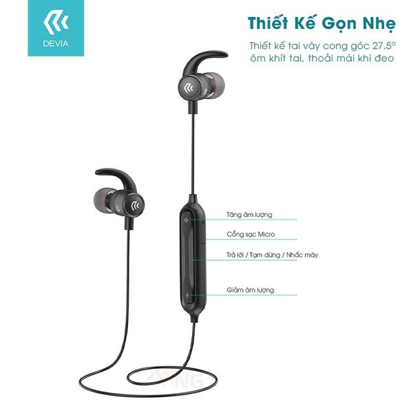 - Sản phẩm Tai nghe bluetooth không dây Thể thao DEVIA Lattice sport là sản phẩm chính hãng, thiết kế công thái học với ốc tai vừa vặn cho người dùng, đeo lâu không bị đau tai